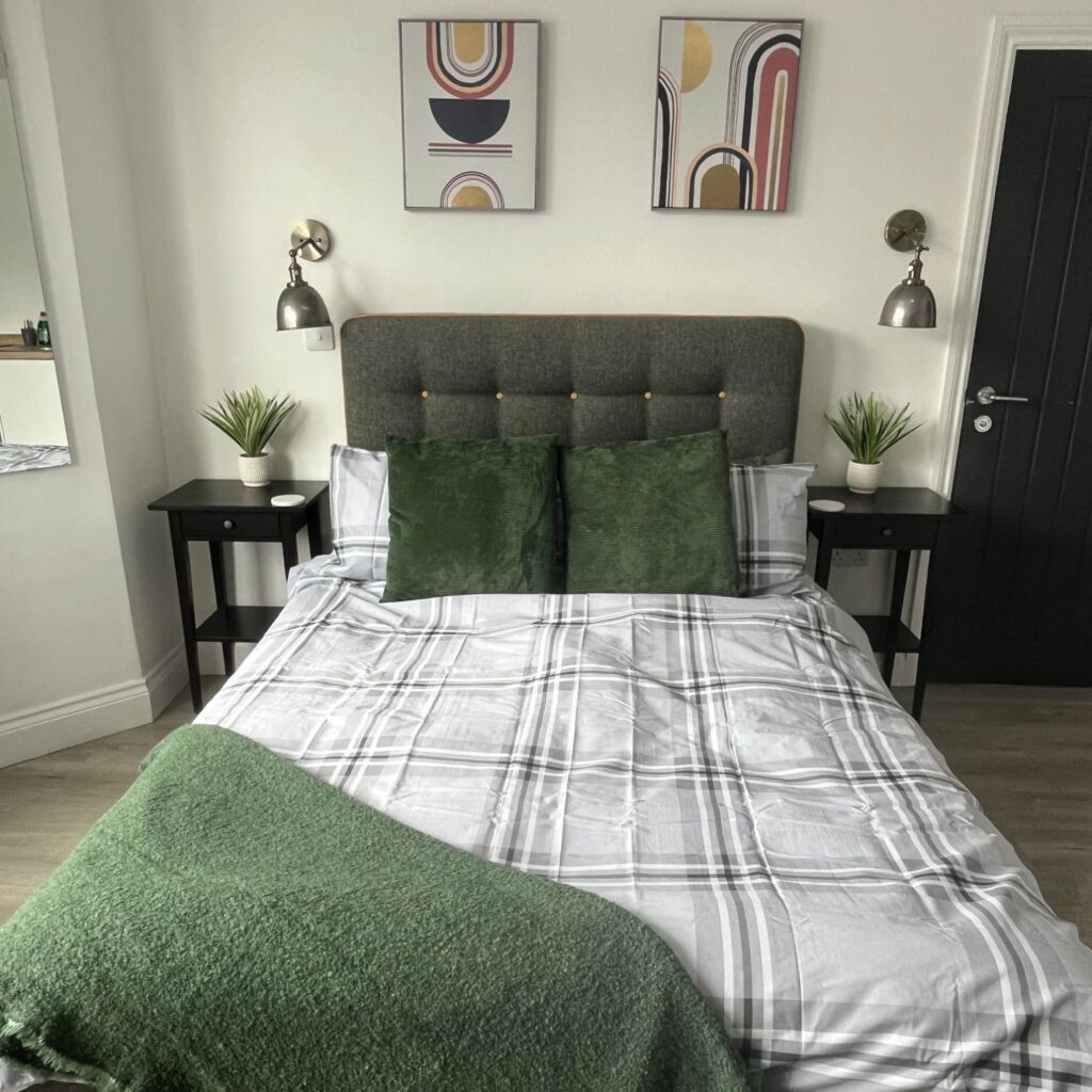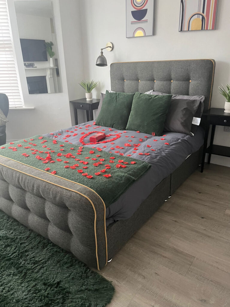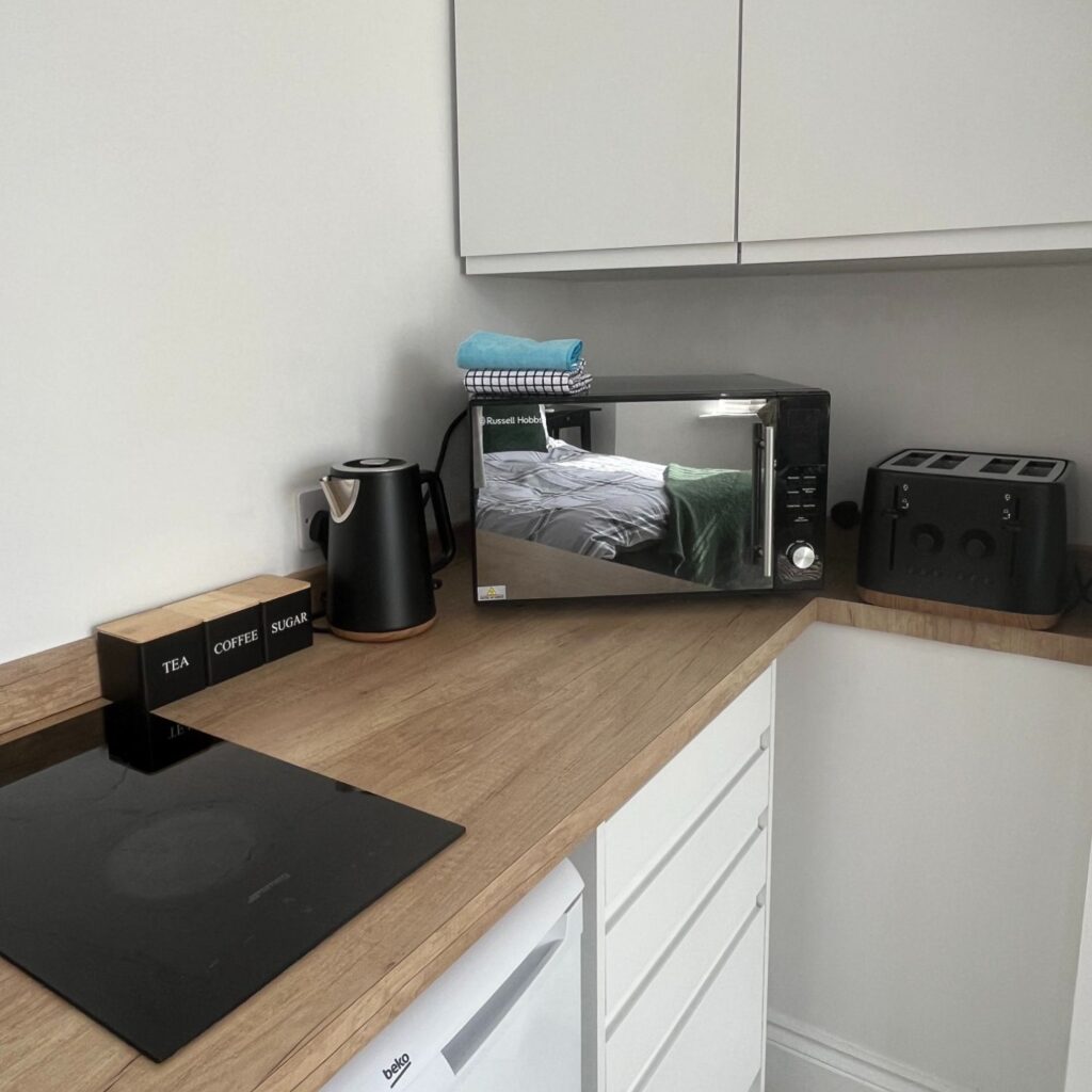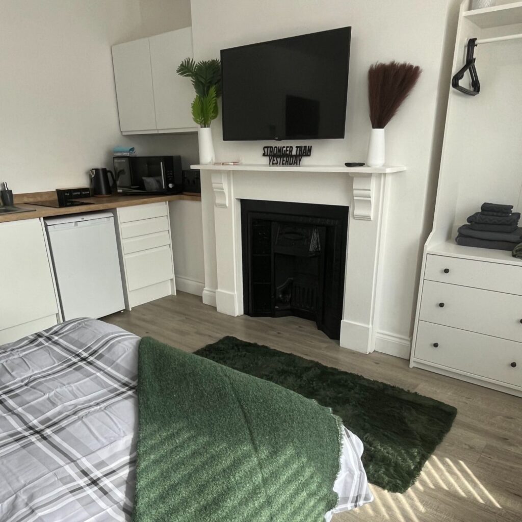 The First Floor Studio Apartment has a beautiful bay window, with a view towards the seafront. The Studio is on the First floor of our serviced accommodation building at the front of the building. It has a brand new double bed, with mini kitchen, seating area and bathroom with rainfall style shower. There is free on-street parking and we are only 200 Metres to the Beach!